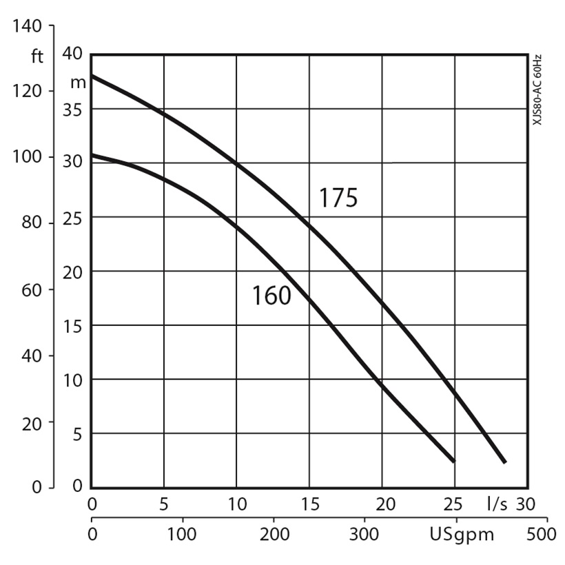 The XJS 80 submersible sludge pump is ideal for pumping sludge and water with suspended solids. Pumps with the AquaTronic unit integrated will always ensure the correct direction of rotation of the impeller, guaranteeing maximum performance and reduced wear. 50Hz: maximum height 35 meters, maximum flow 29 l / s. 60Hz: maximum height 38 meters (125 feet), maximum flow 28.5 l / s (452 gallons per minute).